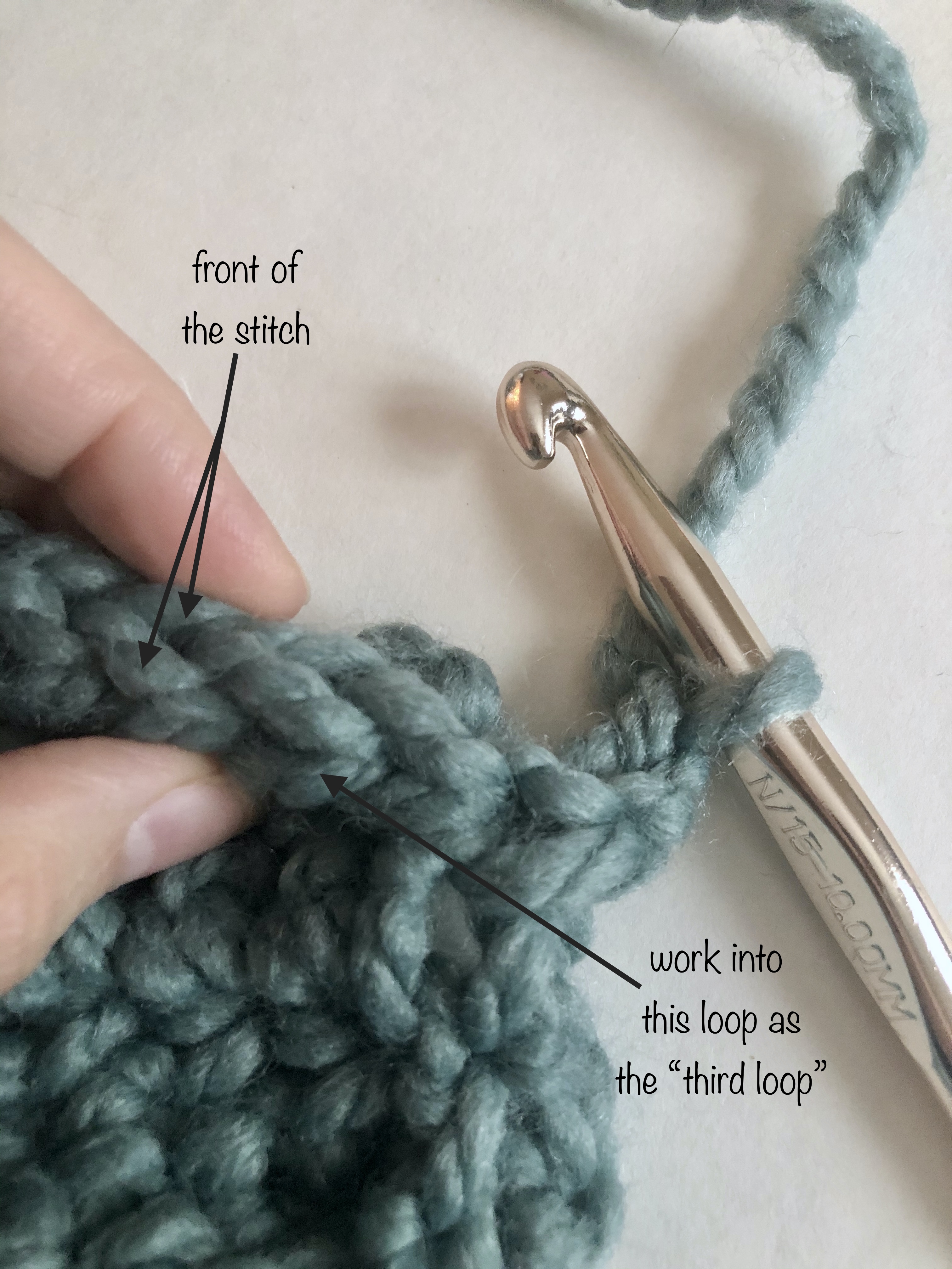 If you have worked camel stitches before, this may sound a bit familiar to you. However, since the camel stitch is typically worked in the round, this third loop is usually located behind the “v” of your stitch. Since we are working this piece flat, this loop will be located at the front of your work.