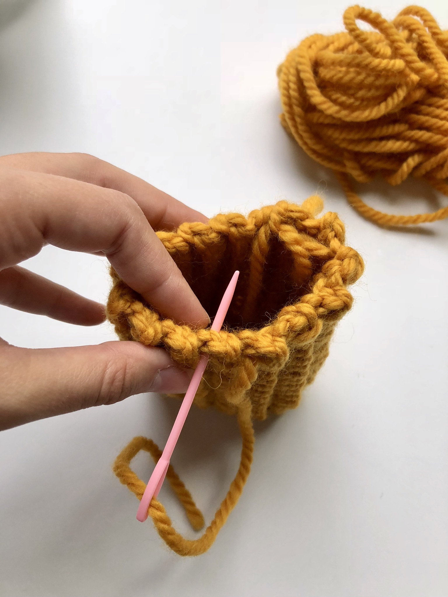 Using the tail, mattress stitch the edges of the first and last rows together (forming a cylinder) and fasten off. Using a strand of yarn, weave in and out across the top gaping created by each row around the cylinder created.