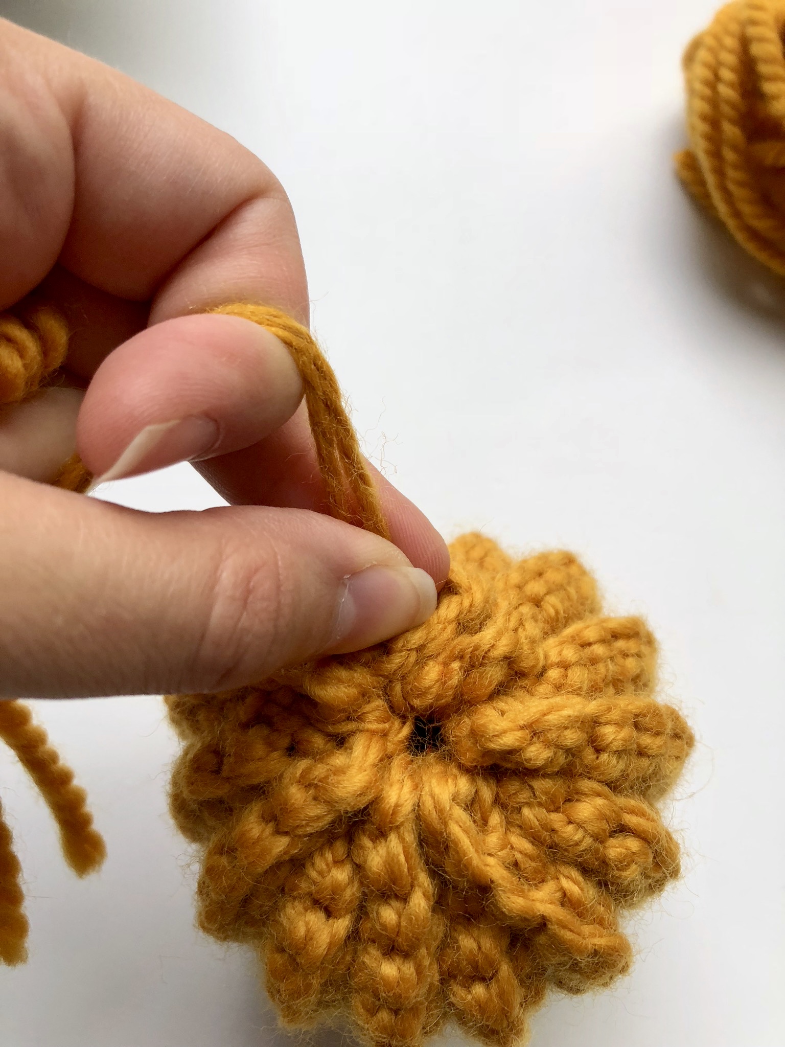 I used a darning needle to pull the yarn strands through the center of the pumpkin and recommend you do the same. Pull each strand as tight as you can and tie off, weaving the ends into the pumpkin.