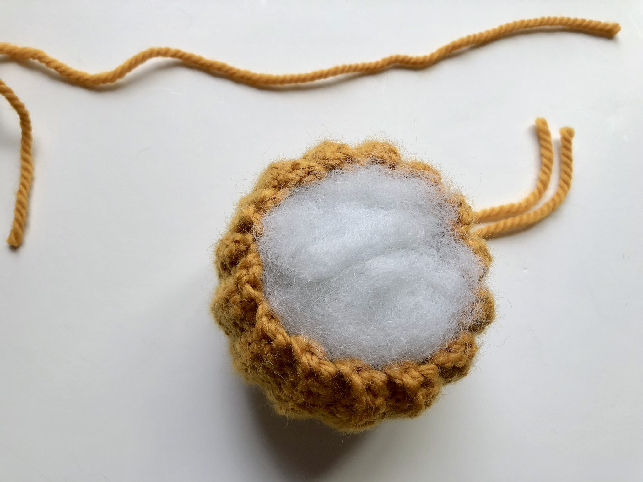 Now you can begin stuffing your pumpkin with fiber fill. The firmer you stuff, the taller and more plush your pumpkin will be and the larger the ribbing will turn out. Using less fiber fill will result in a shorter and more defined pumpkin.