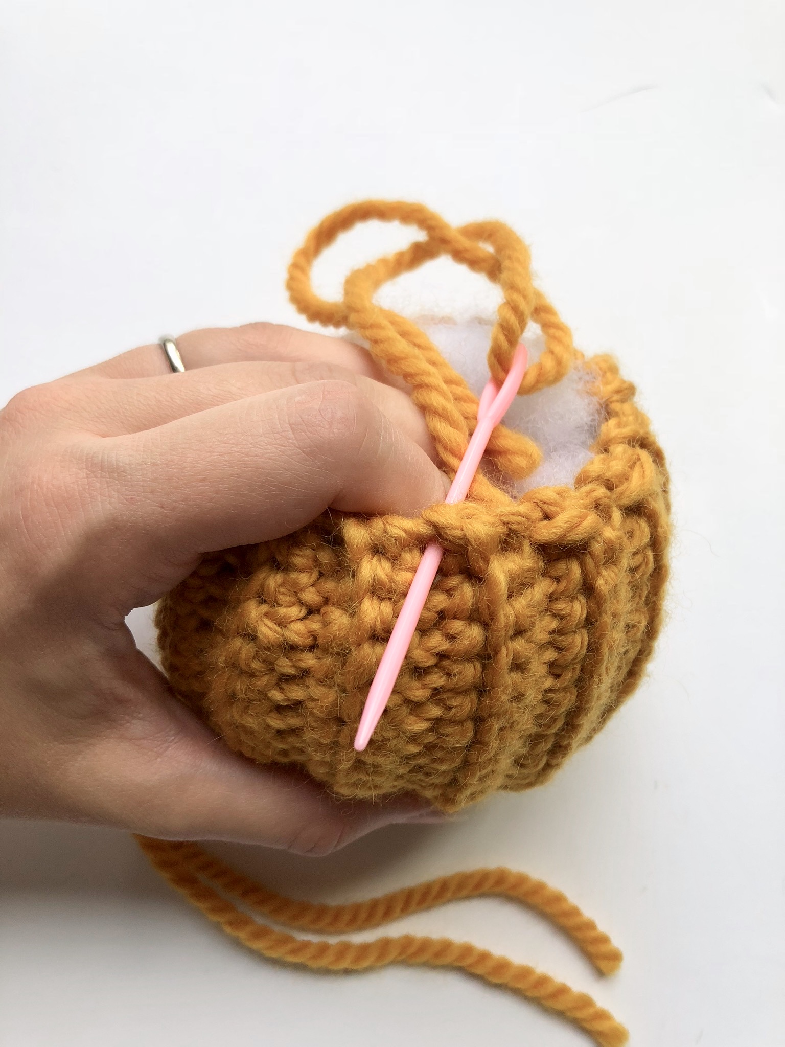 You should now have 4 strands hanging off your pumpkin (two on the bottom and 2 on the top). Using a darning needle, take each strand and wrap around the outside of the pumpkin’s body and pull through the center. Tie off as tight as you can and weave in the ends. If you would like more divots, add 2-4 additional strands around.