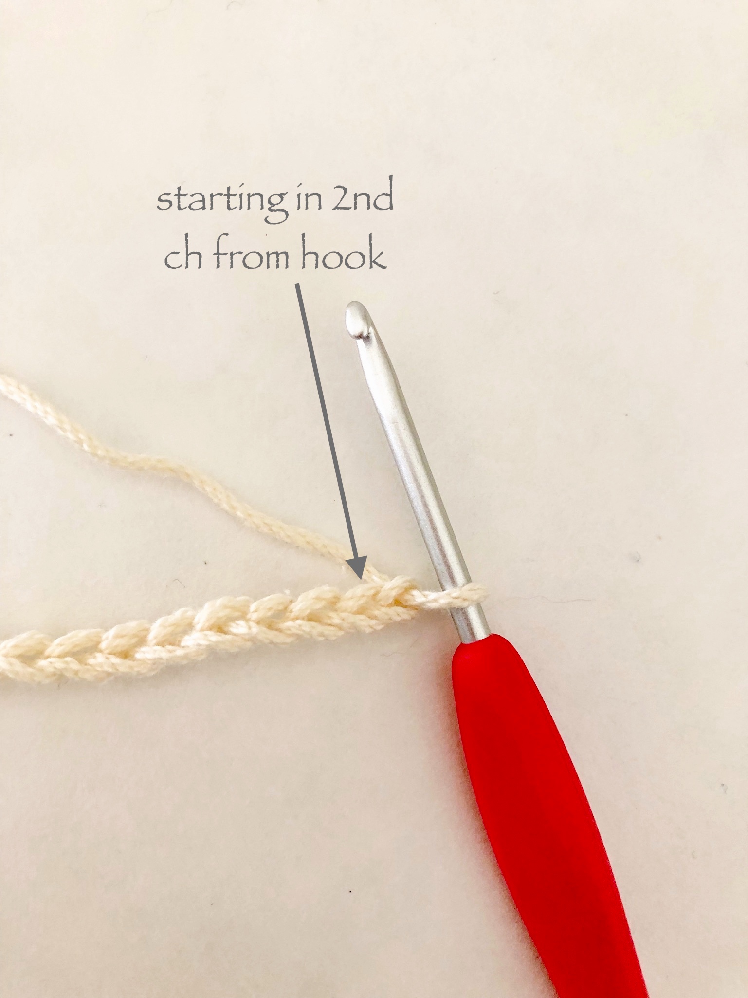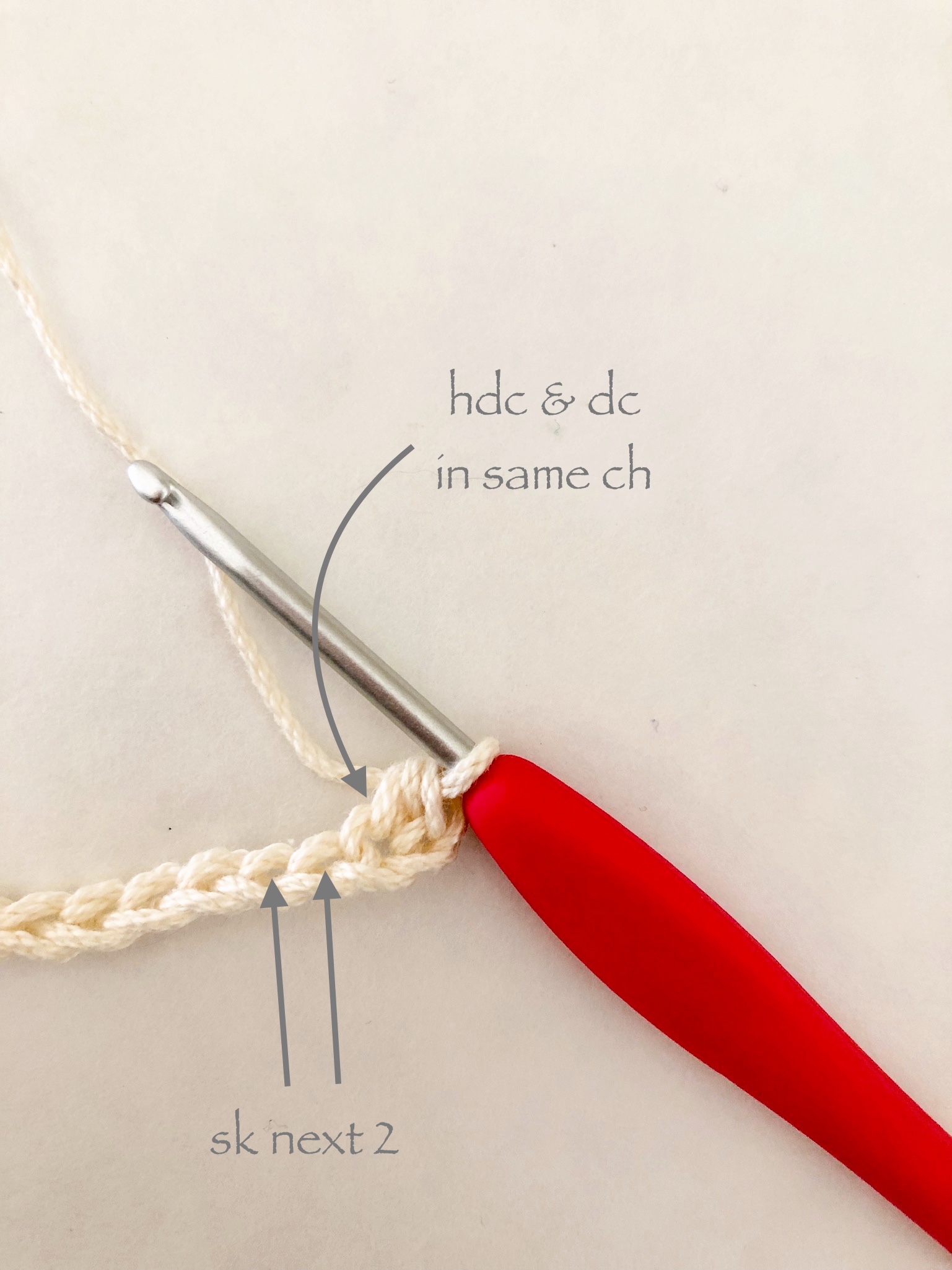 Then, starting in the 2nd chain from your hook you will; half double crochet, and double crochet (into the same chain).