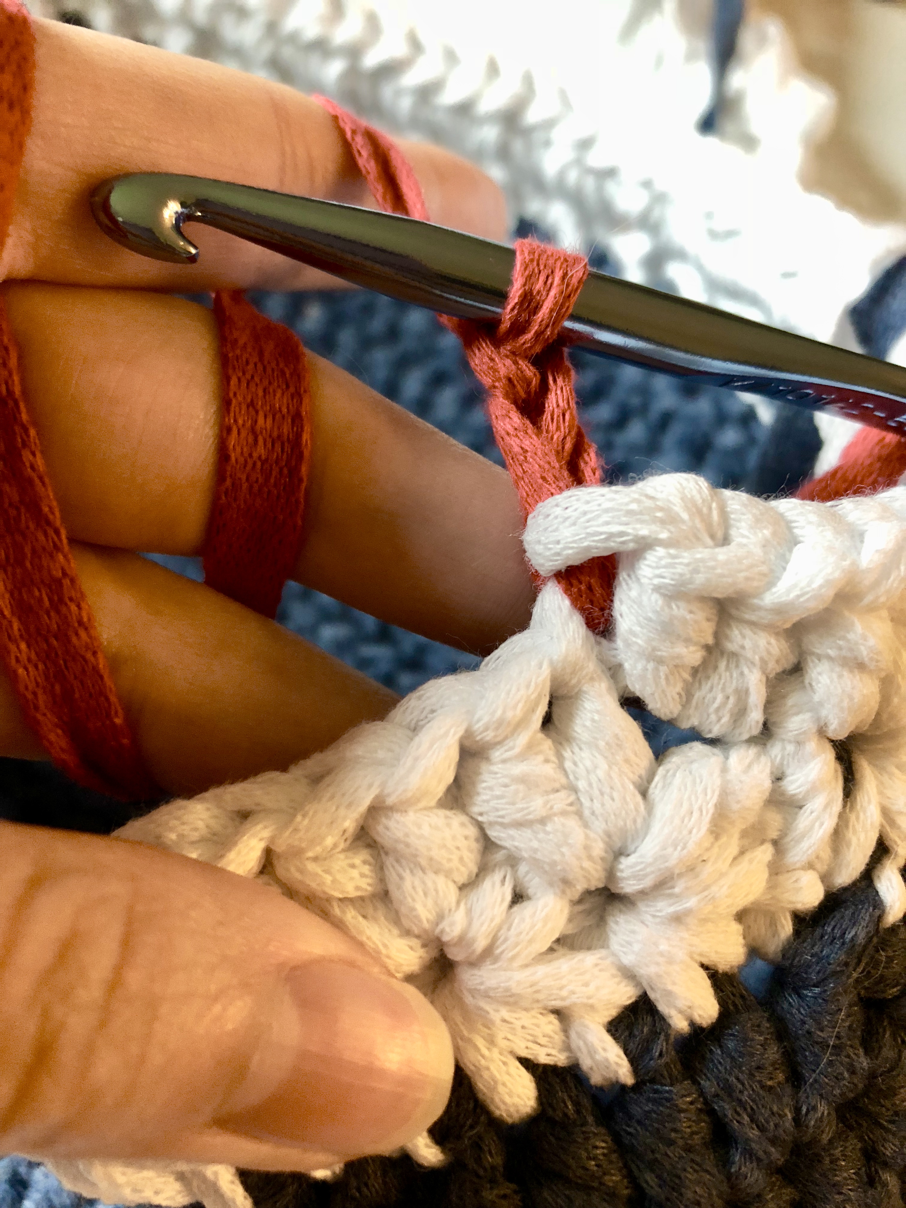 To work the red portion, you will simply be working 2 rounds of half double crochets.