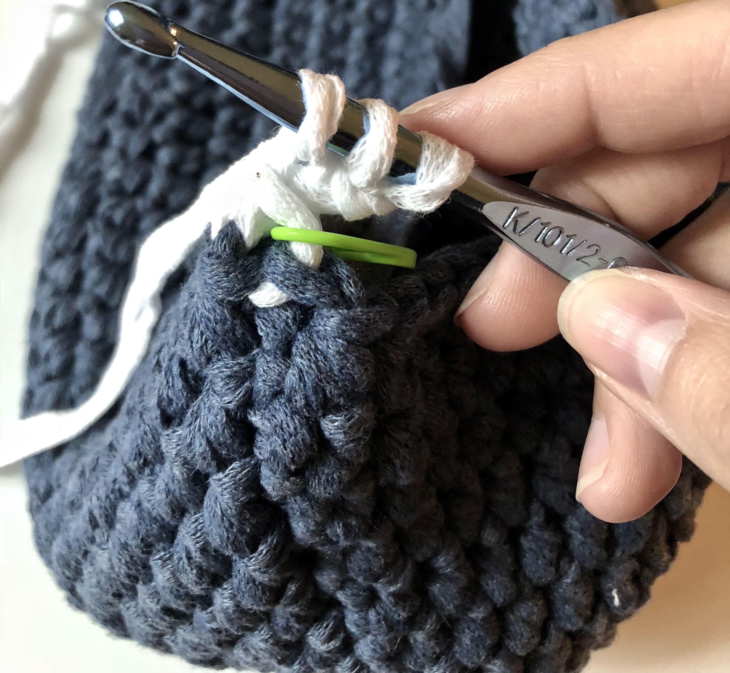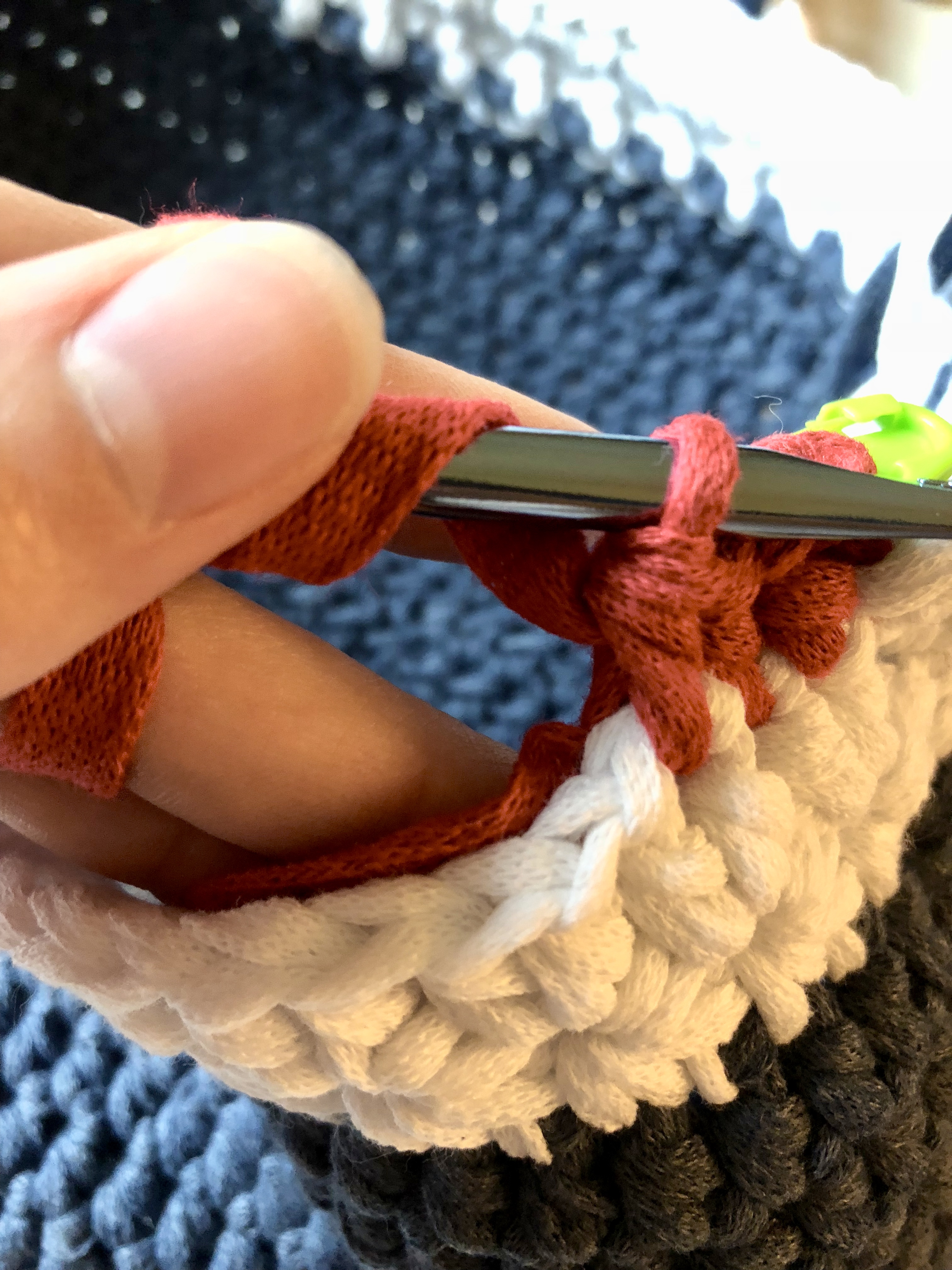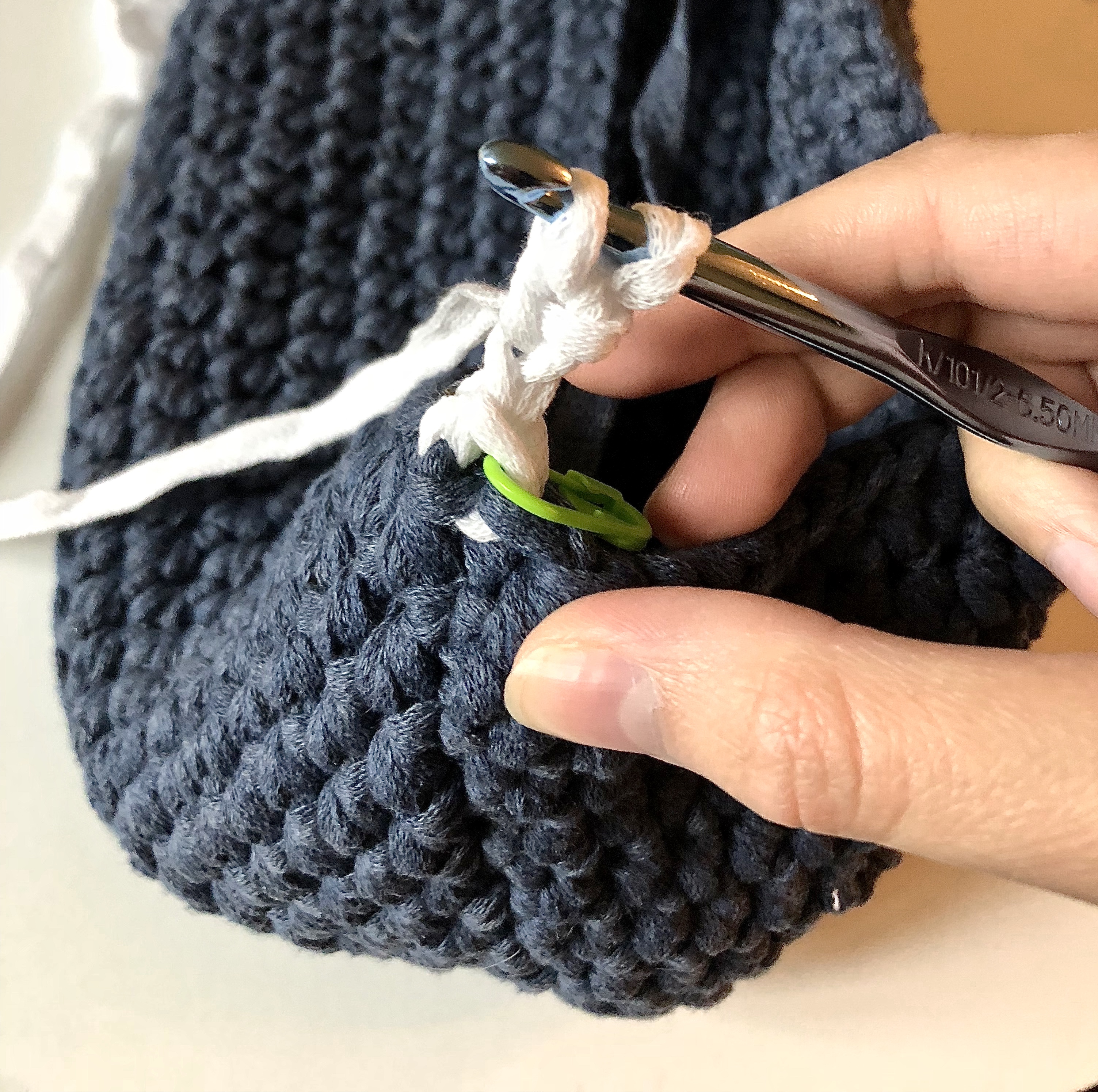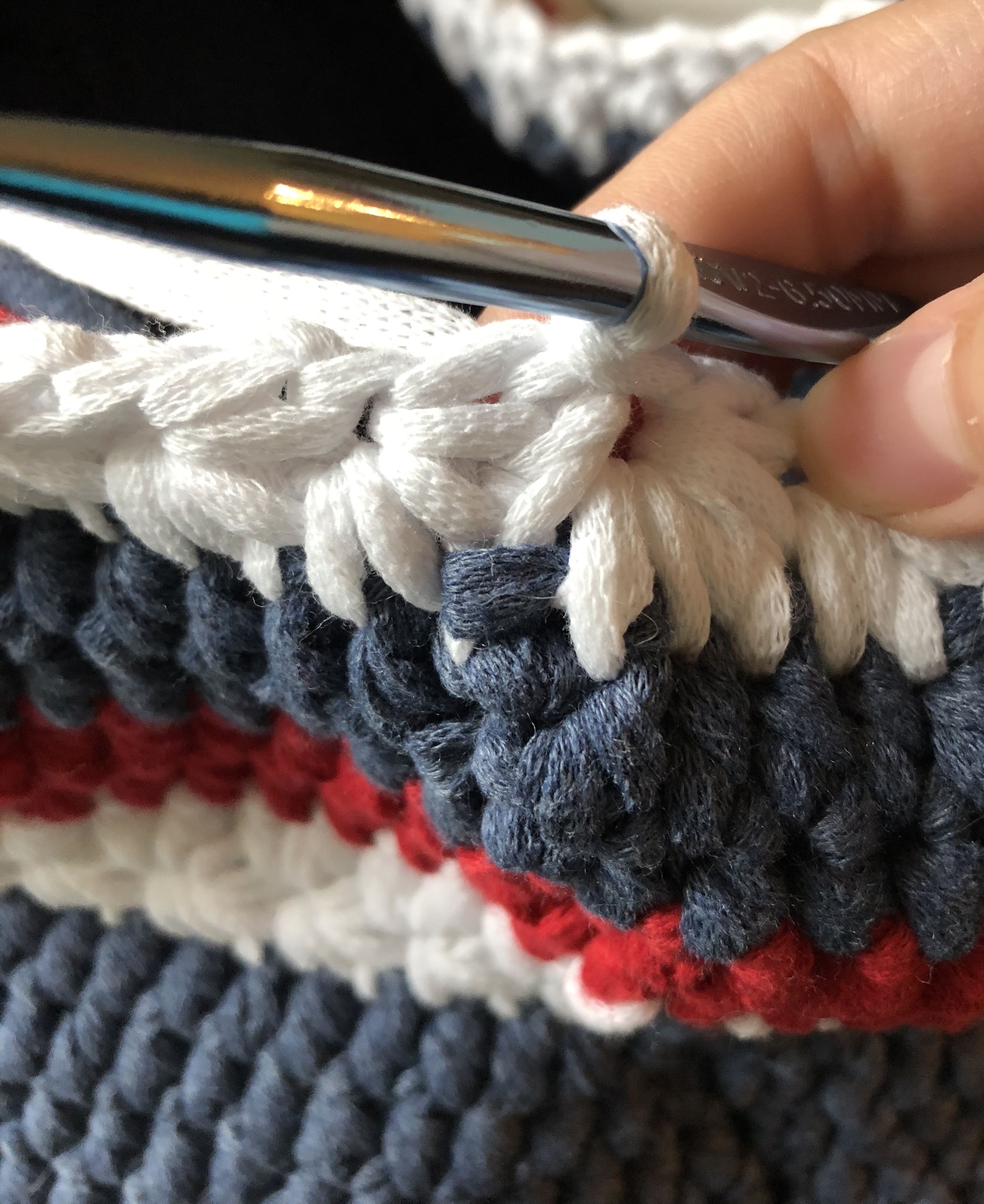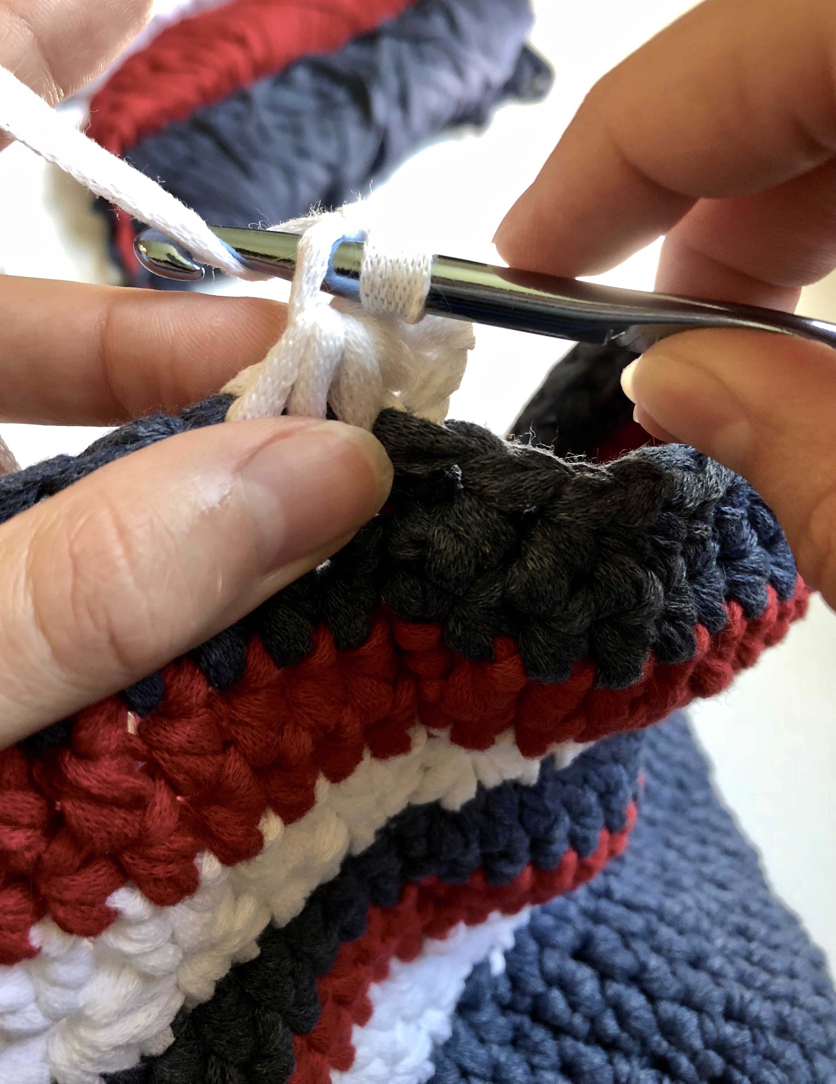 After the glue had set, I inserted the yarn through my half double crochet stitches. Rather then counting and figuring out an exact stitch of where to place the rope, I simply measured 4 1/2″ from either side of the tote in and found the stitch closest to that. I also made sure that this stitch was 4 rounds up from my last blue round.
