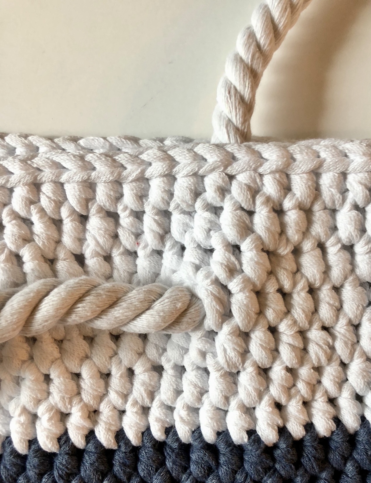 I repeated this process on the other side of the rope and tote, then again using my second strand of rope to make a handle for the opposite side.