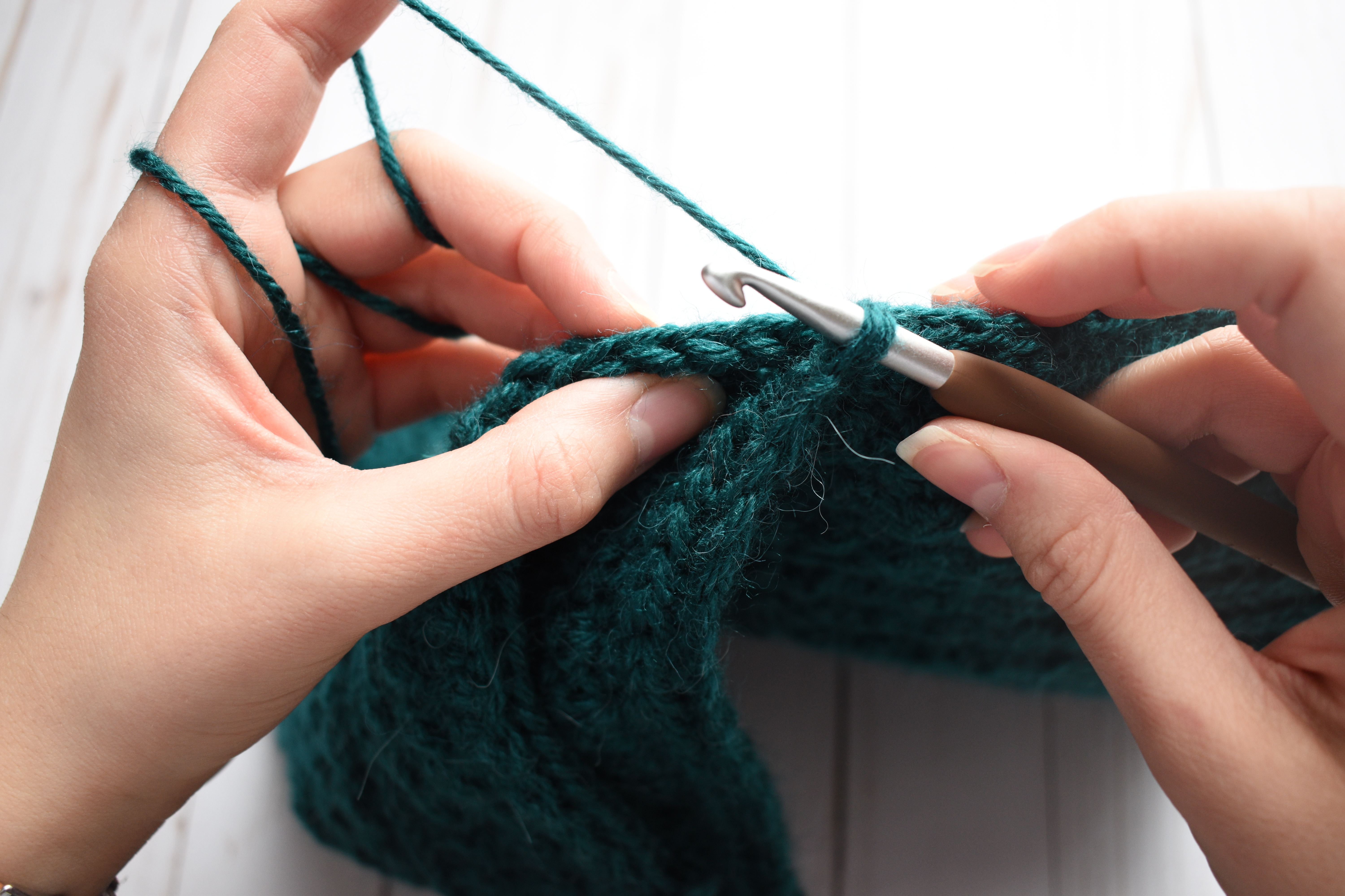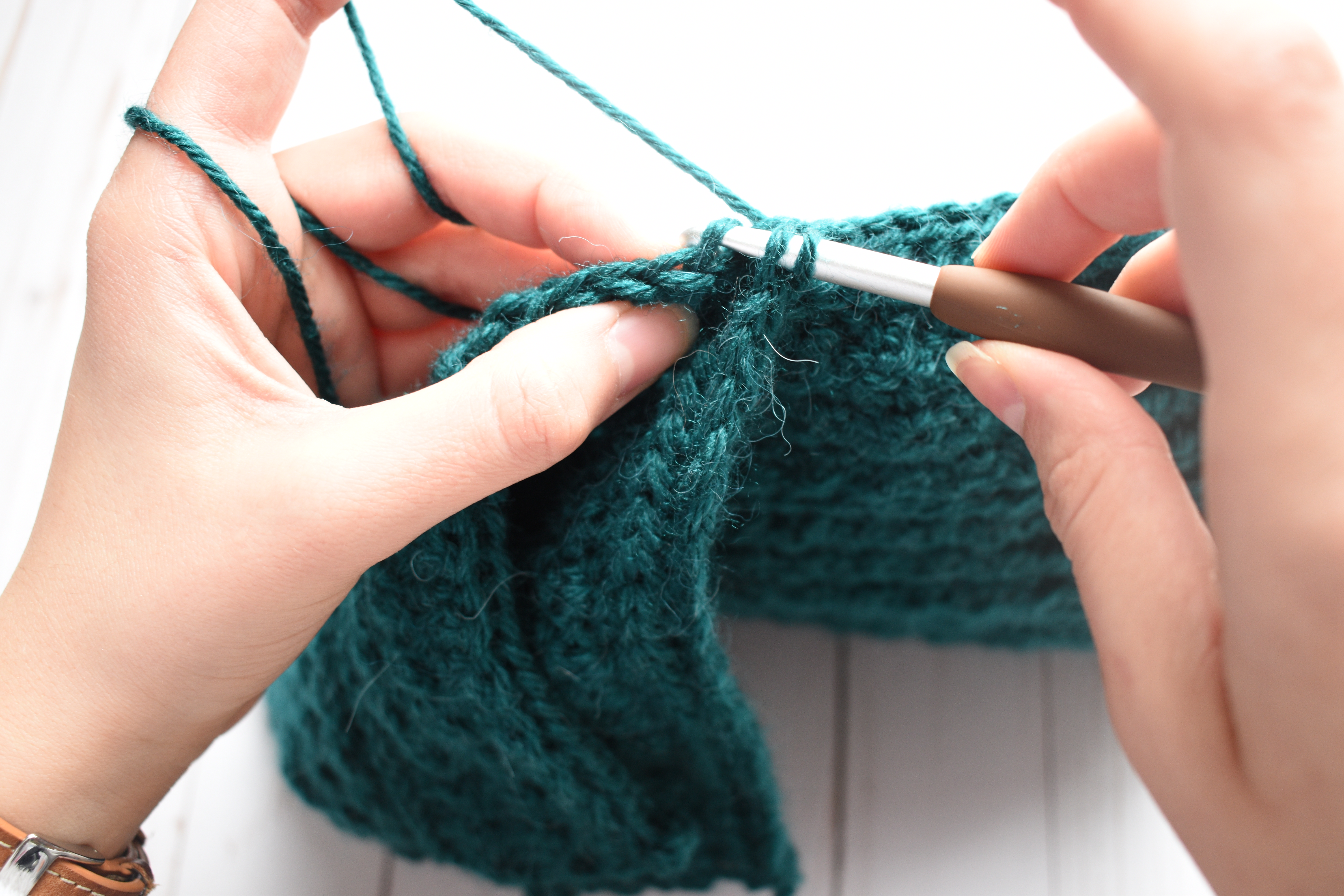 It’s important to make sure you’re working into the 3rd loop (or the “hump”) of the half double crochet rather than into the back loop or both loops as previously. This will make sure that the “V” of the stitch is facing out when you turn the beanie right side out again.