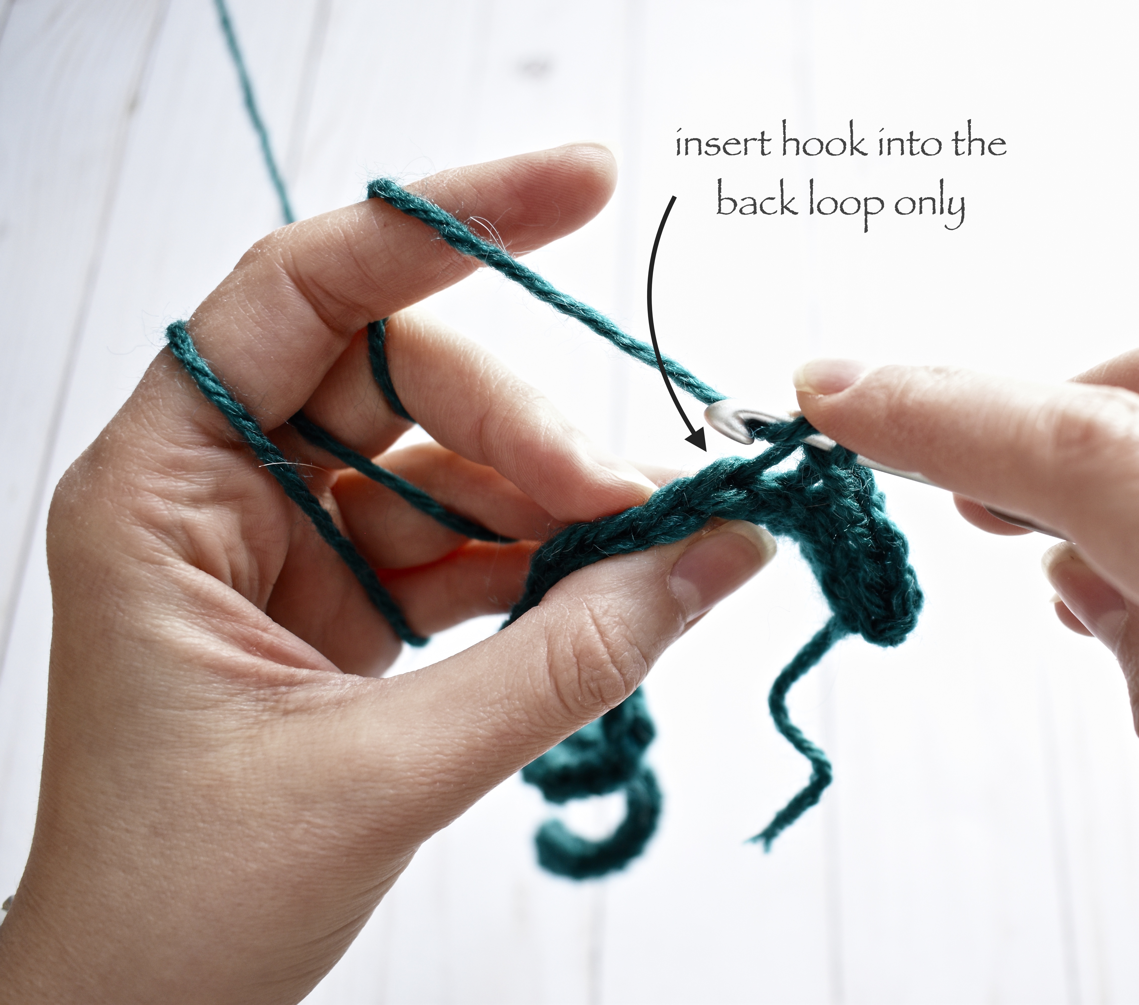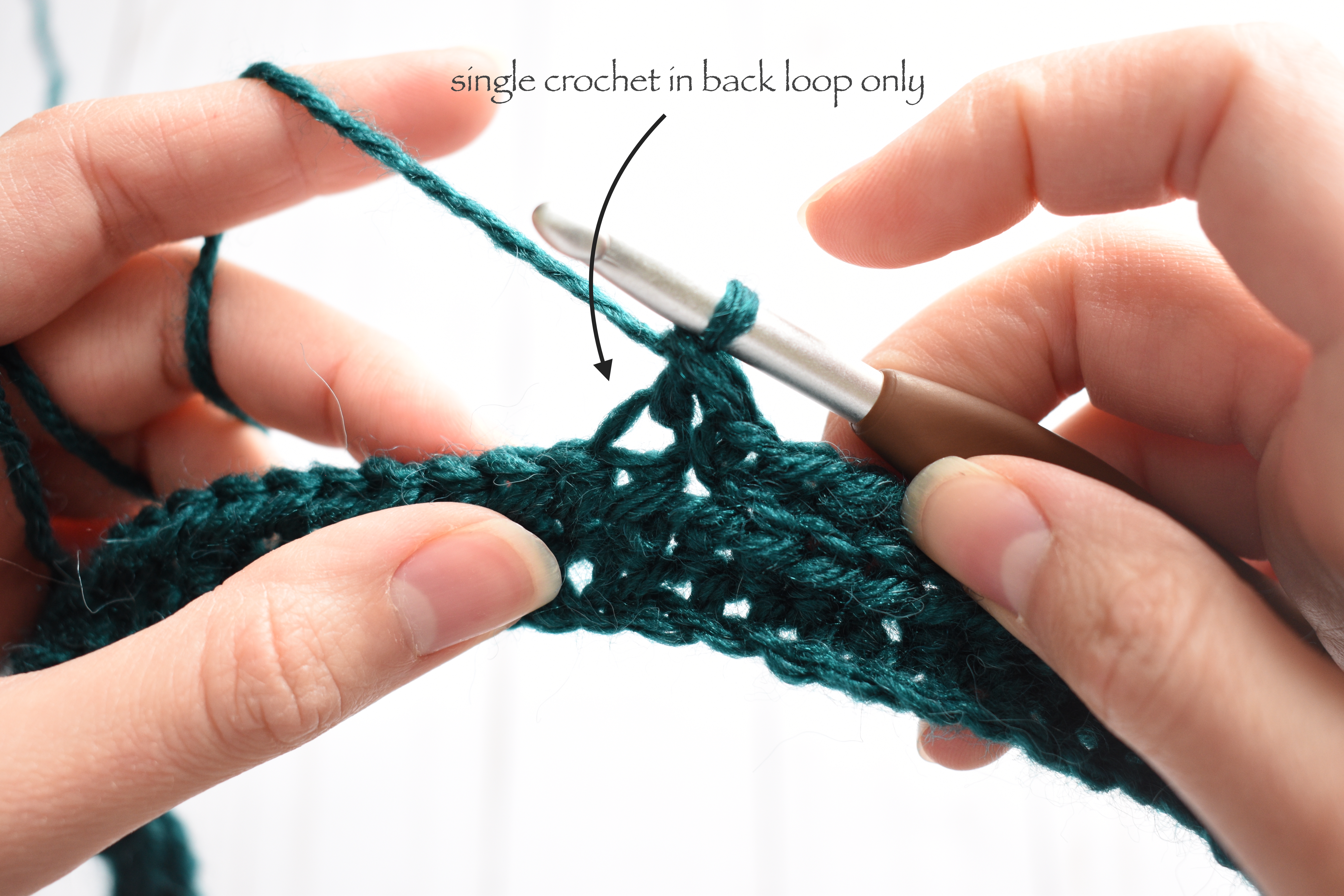 You’ll start by working a single crochet in the back loop only