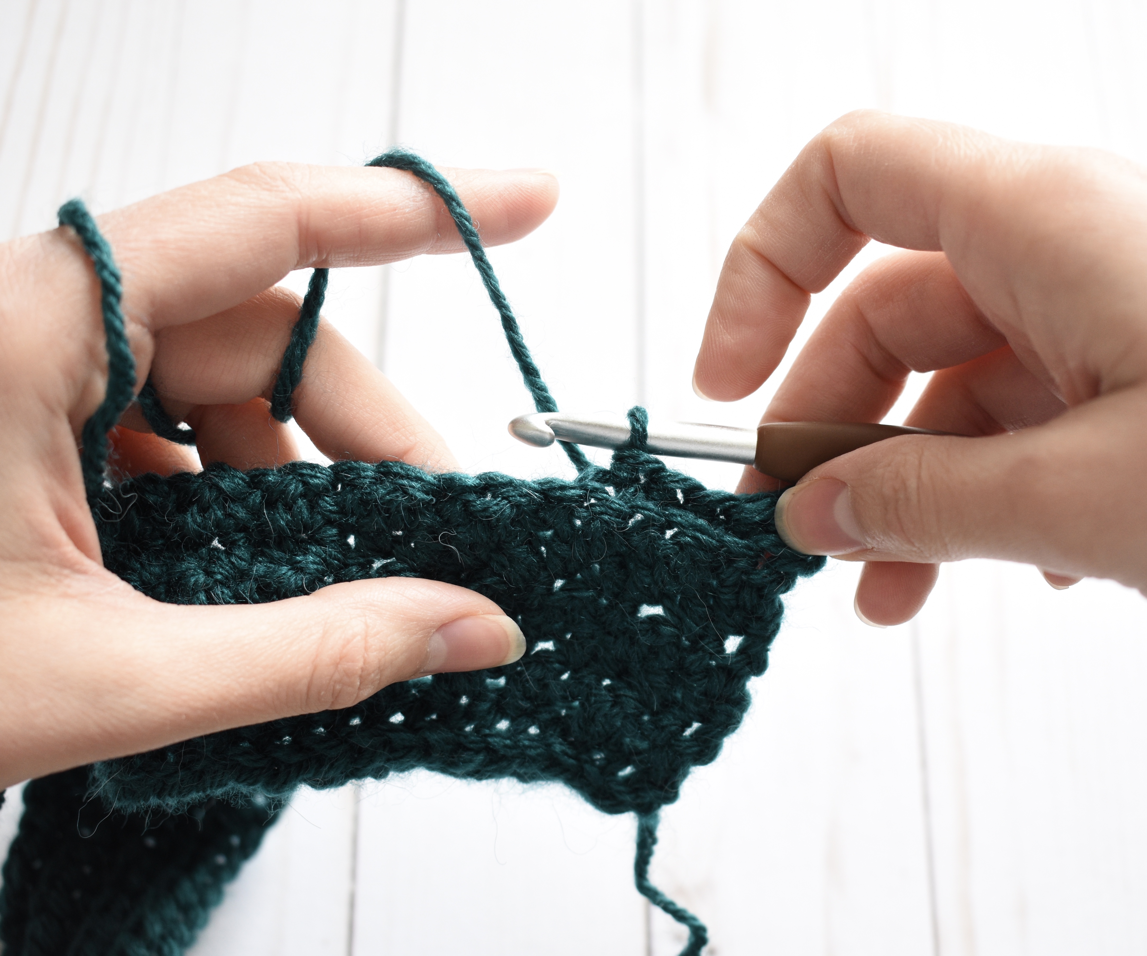 To work the half double crochet slip stitch, you will yarn over then insert your hook into the designated stitch and pull up a loop. To complete, you’ll pull that loop through the 2 loops on your hook.