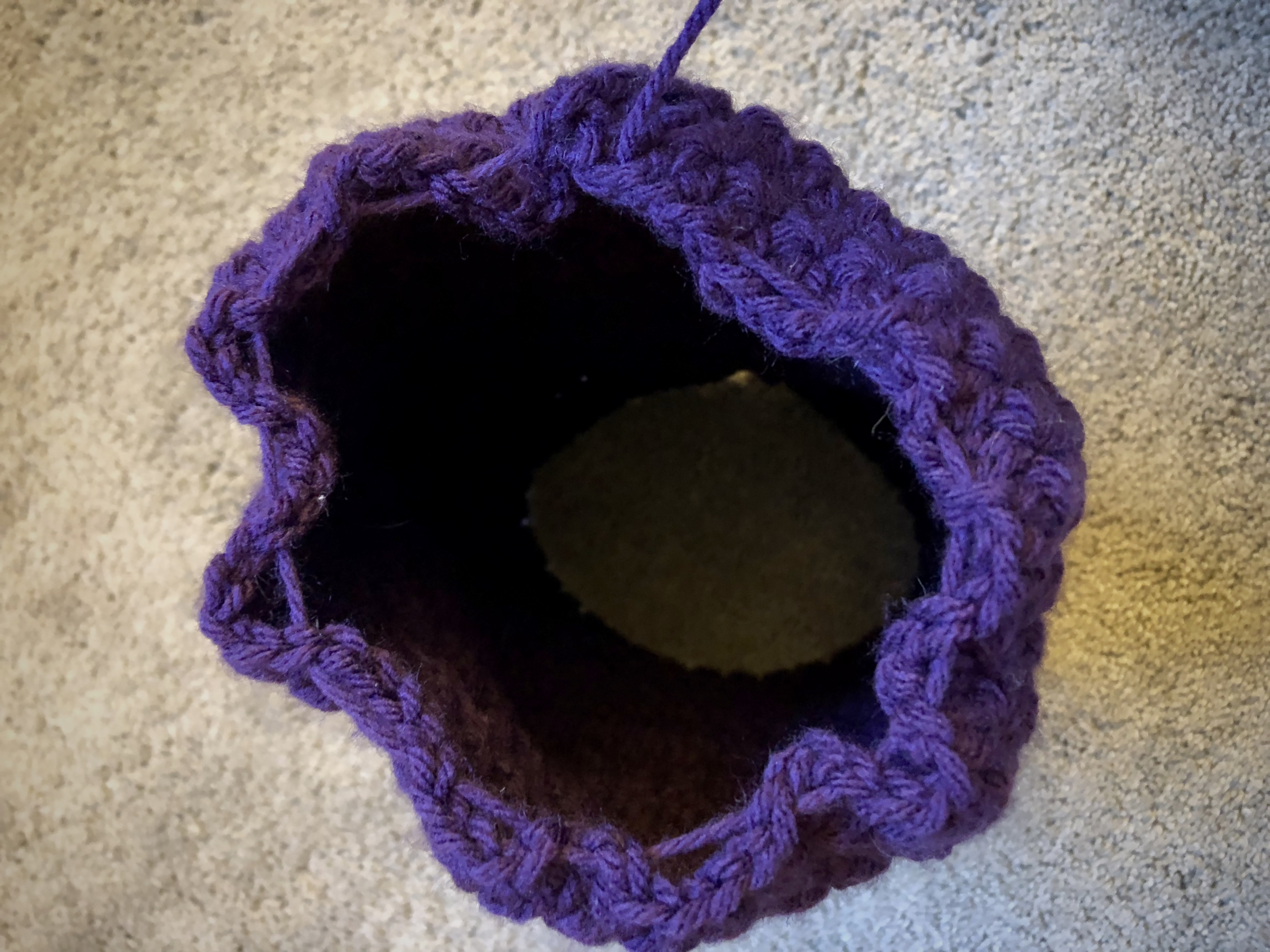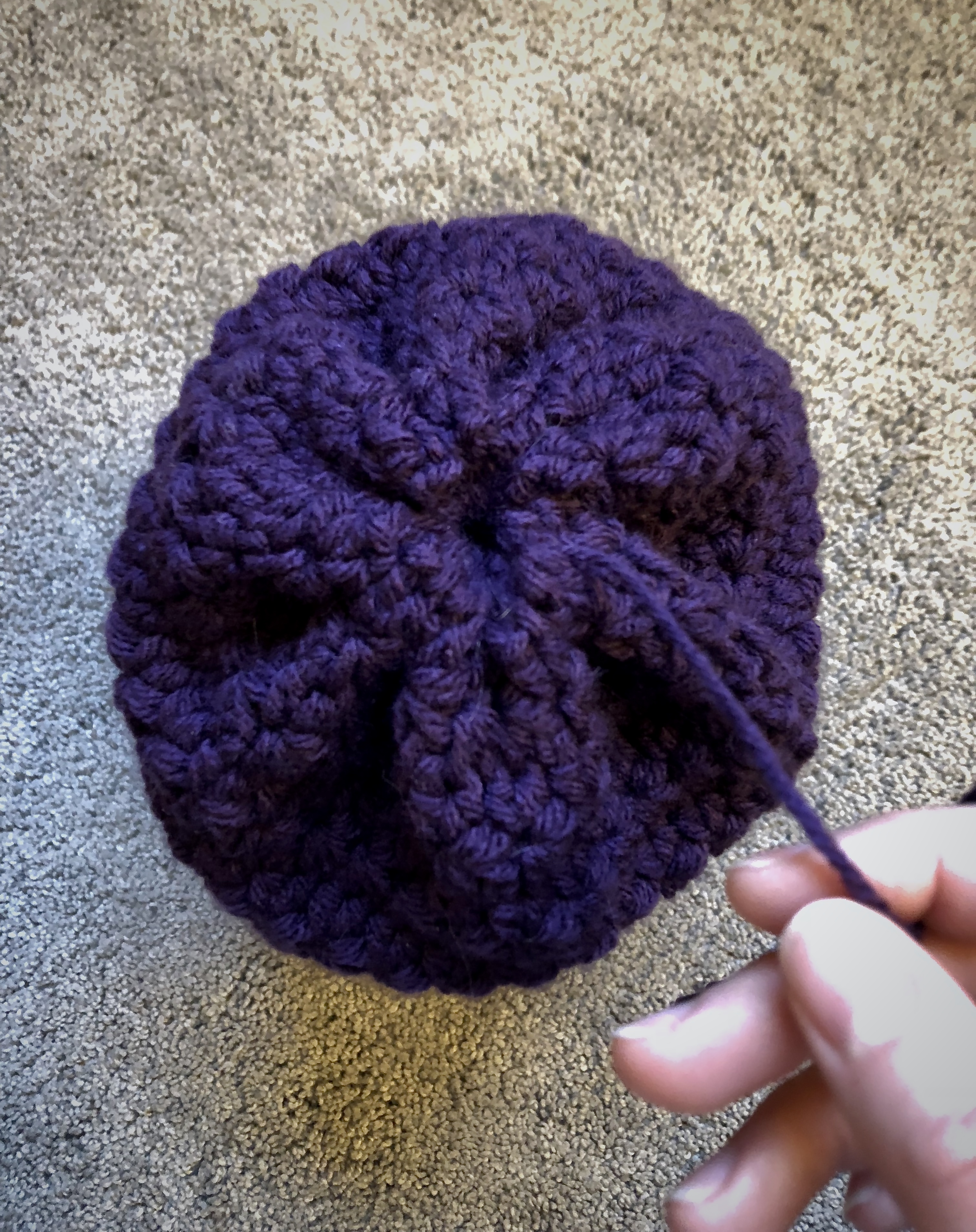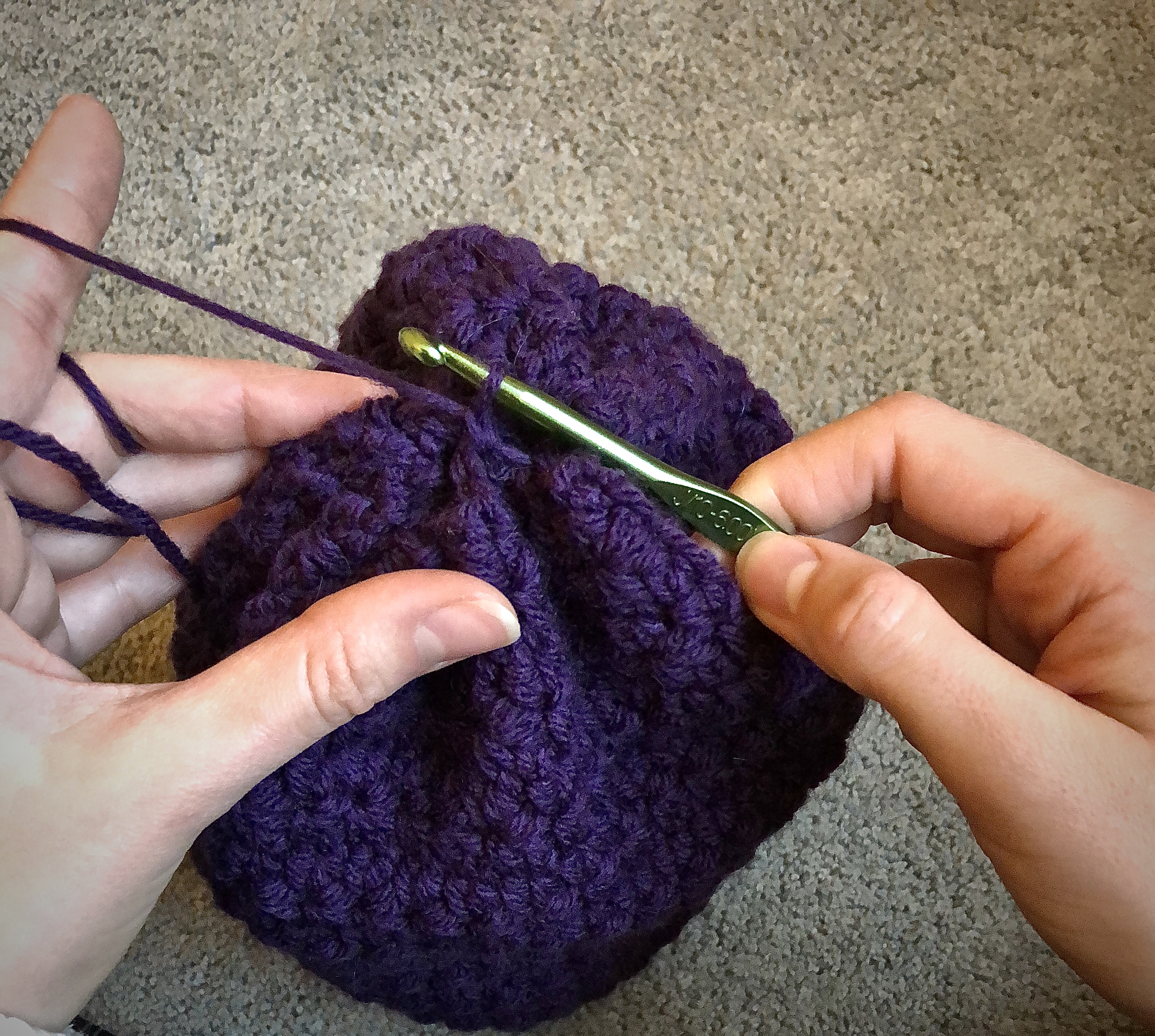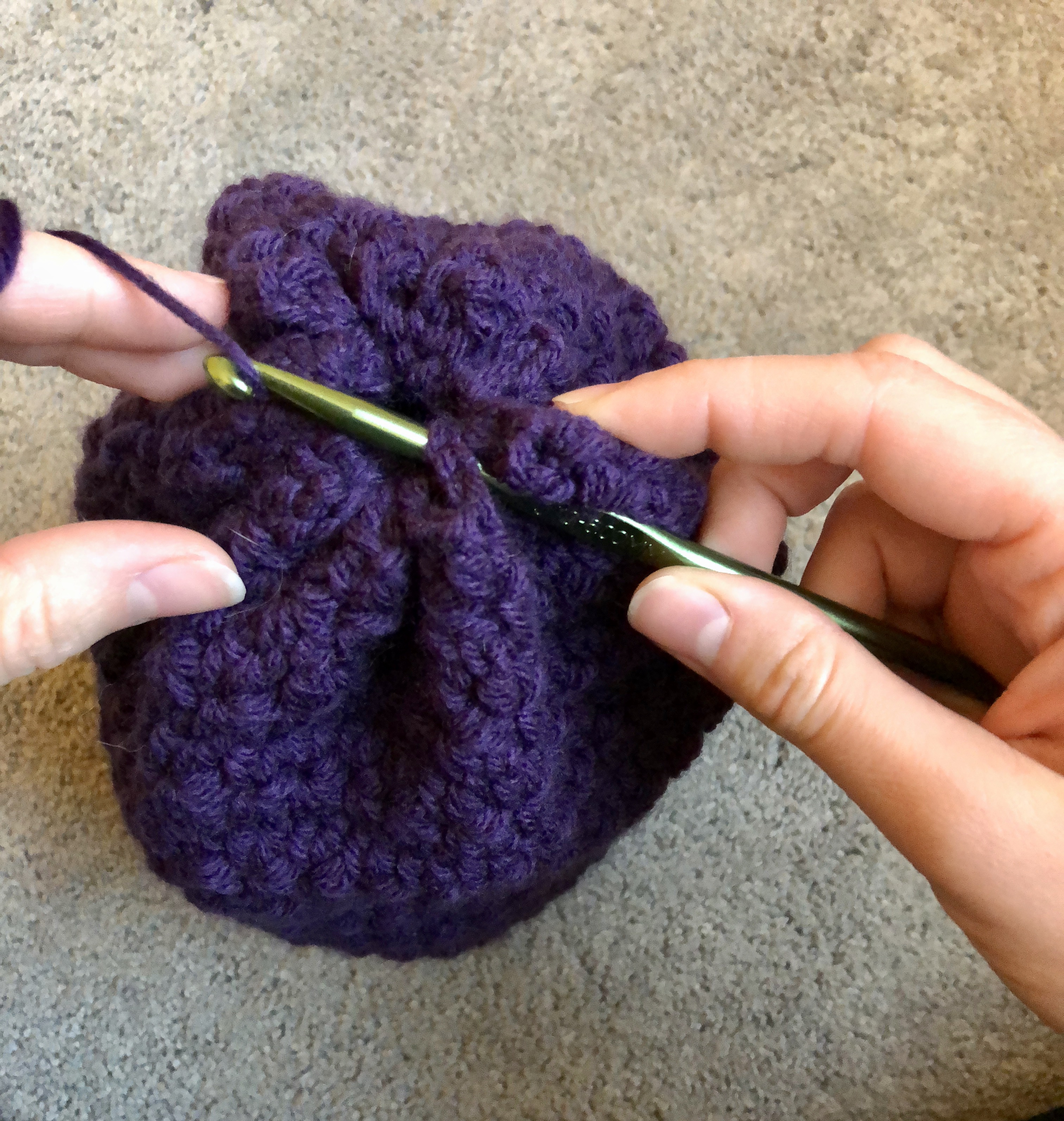I completed the slouchy by weaving the tail through every few stitches around the top round, then pulled the tail tight and slip stitched in a stitch on the opposite side, like so: