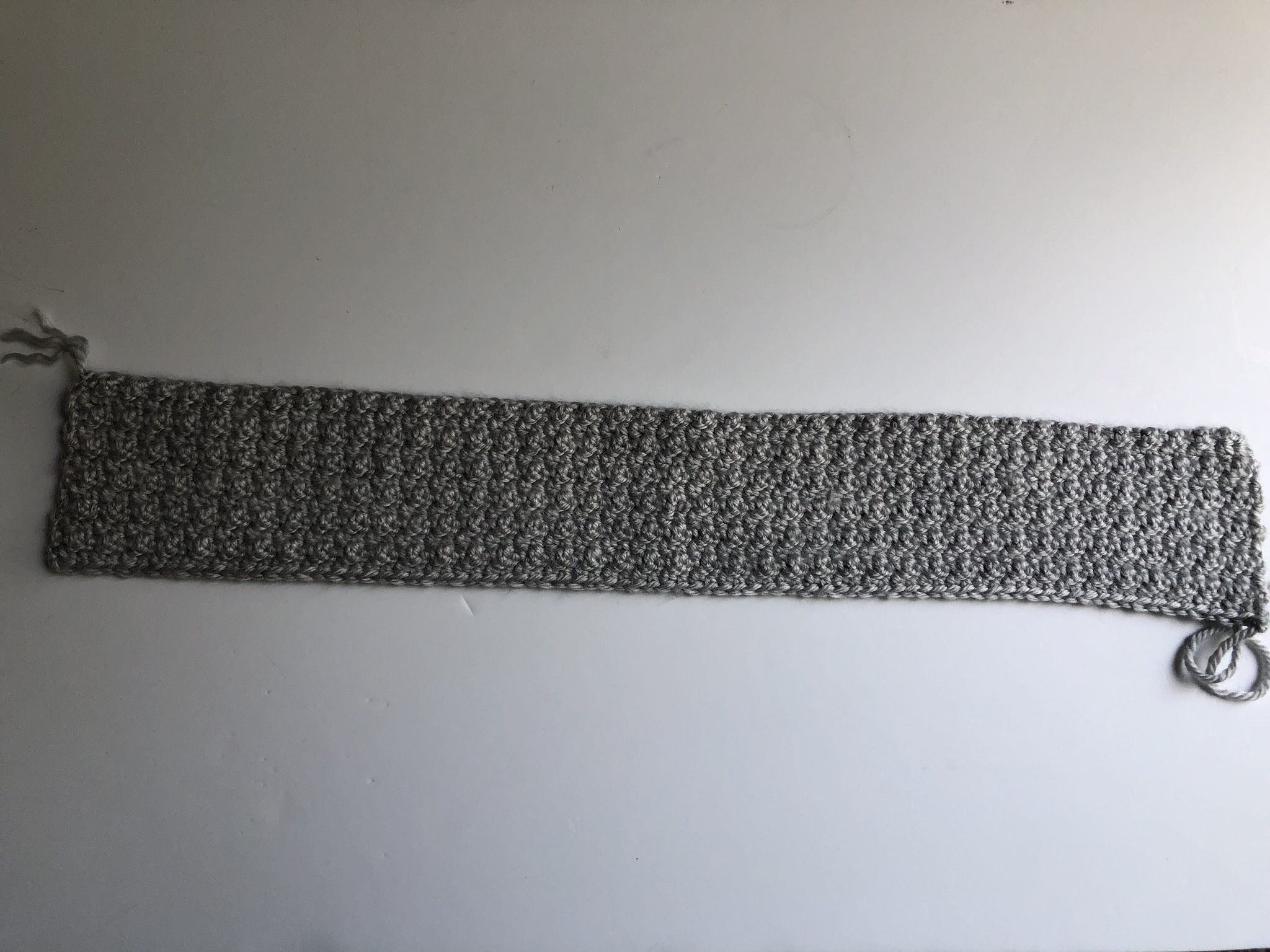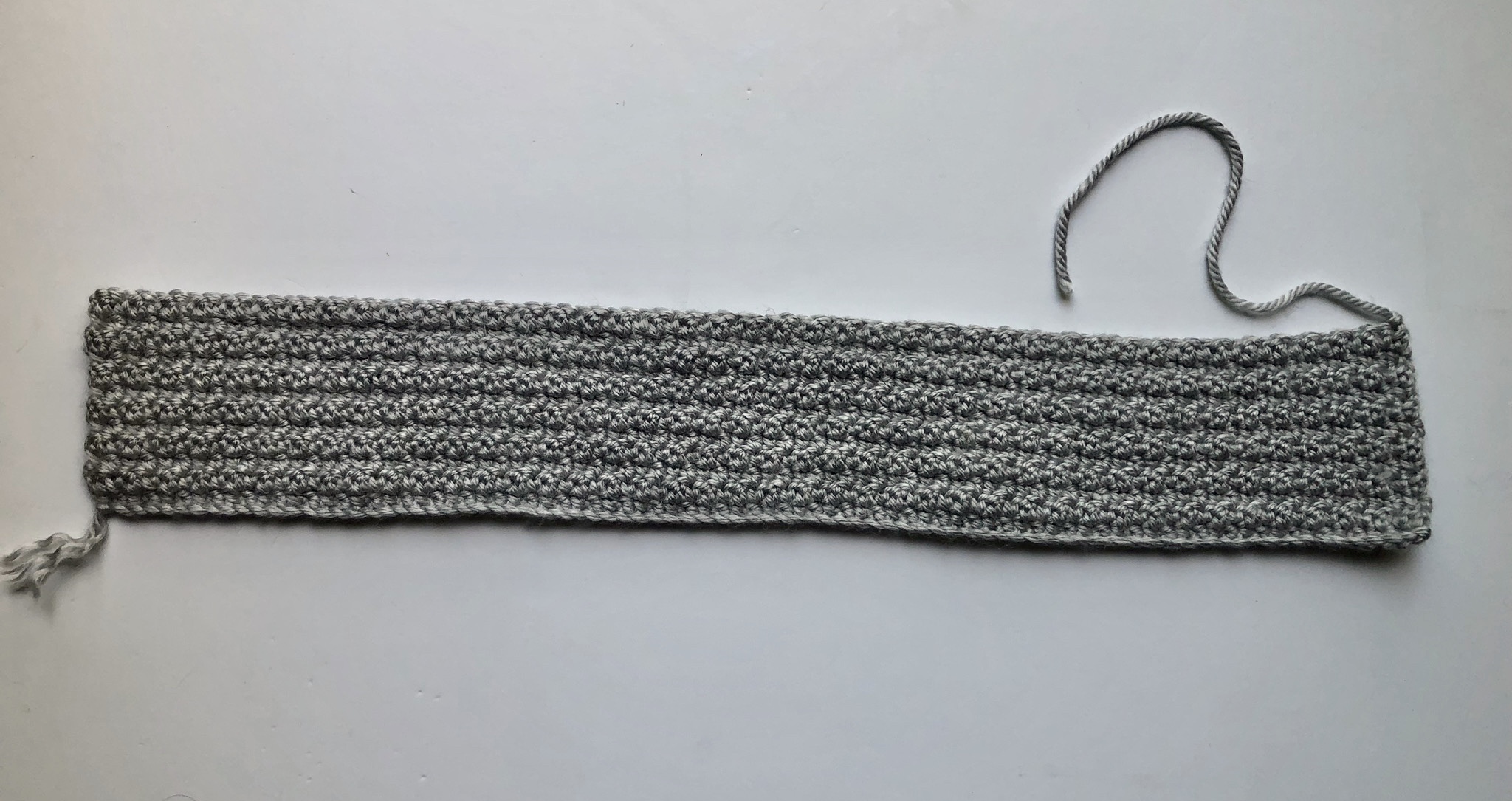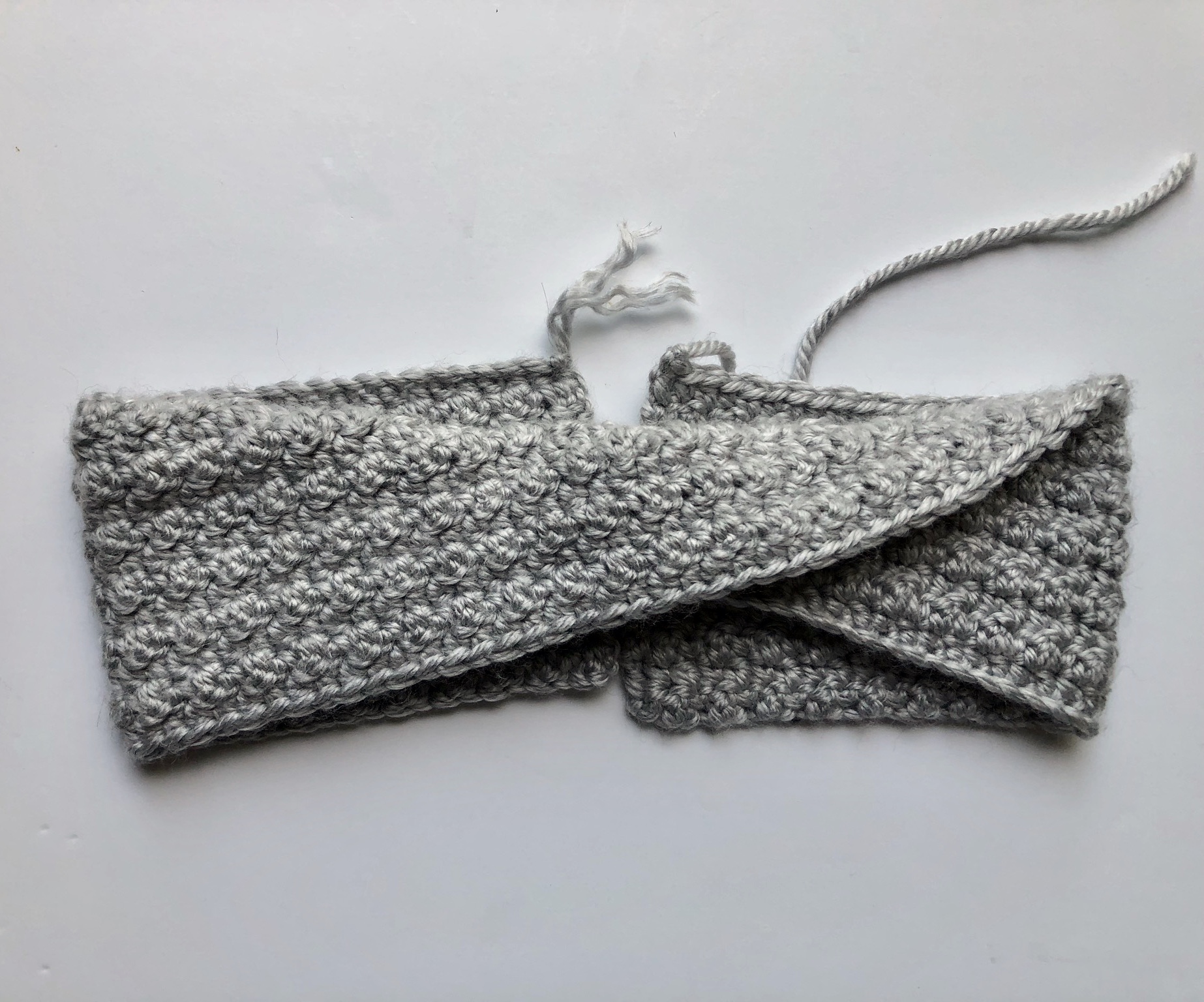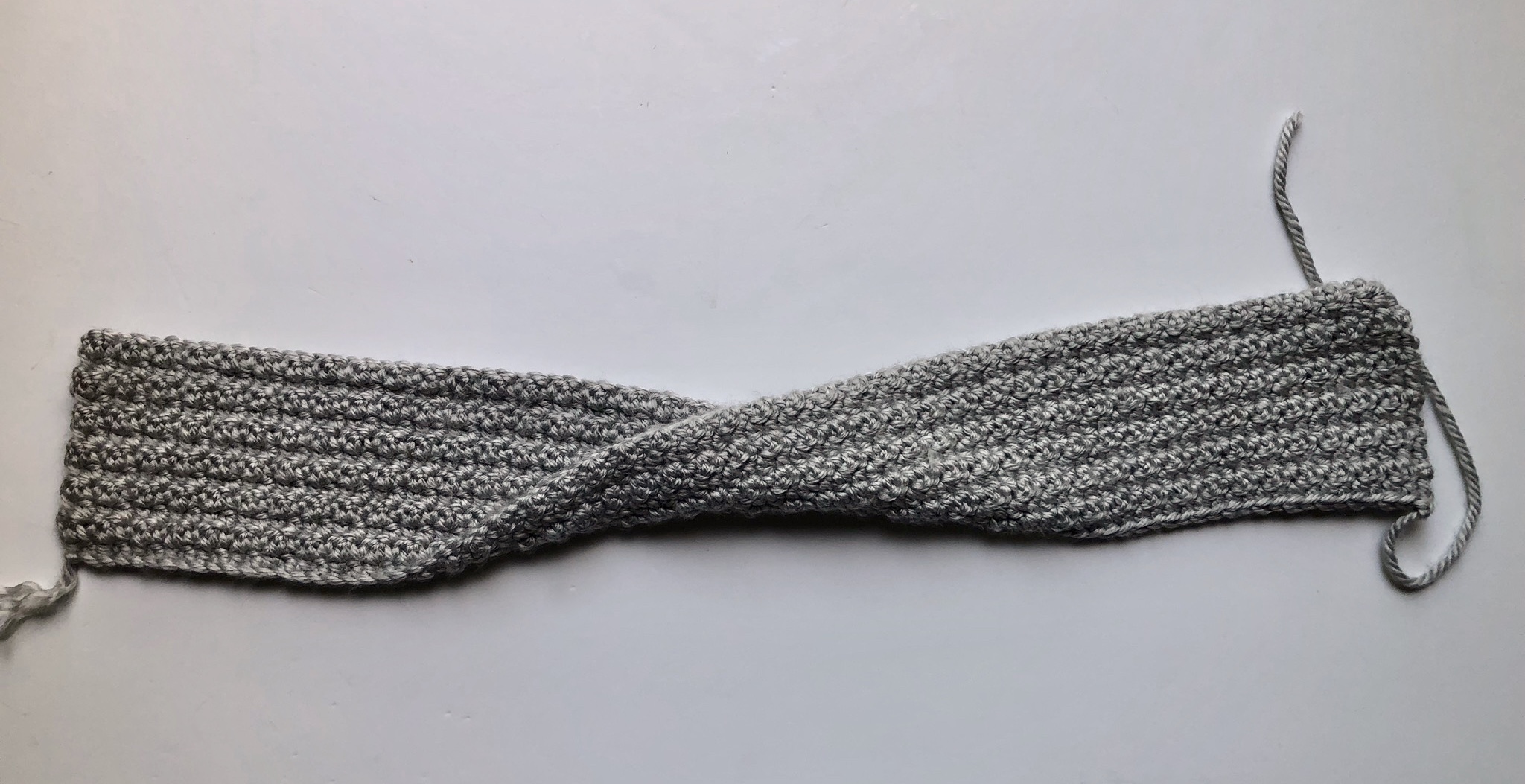 After working the amount of rows needed to achieve the width of your headband, you will fasten off leaving a tail and start assembly.