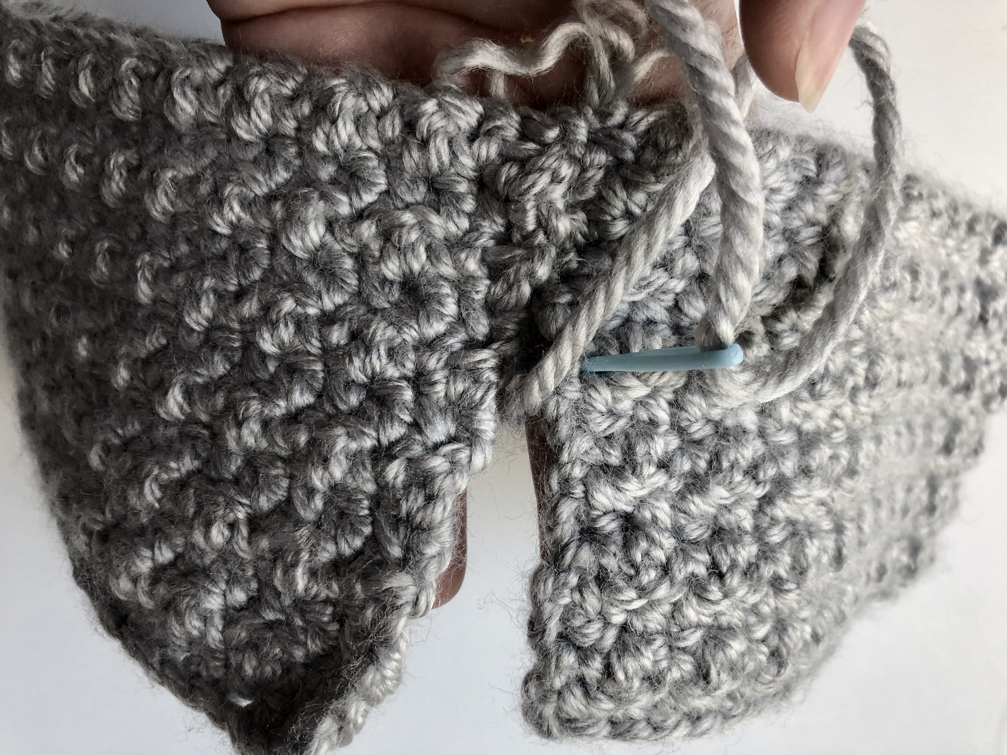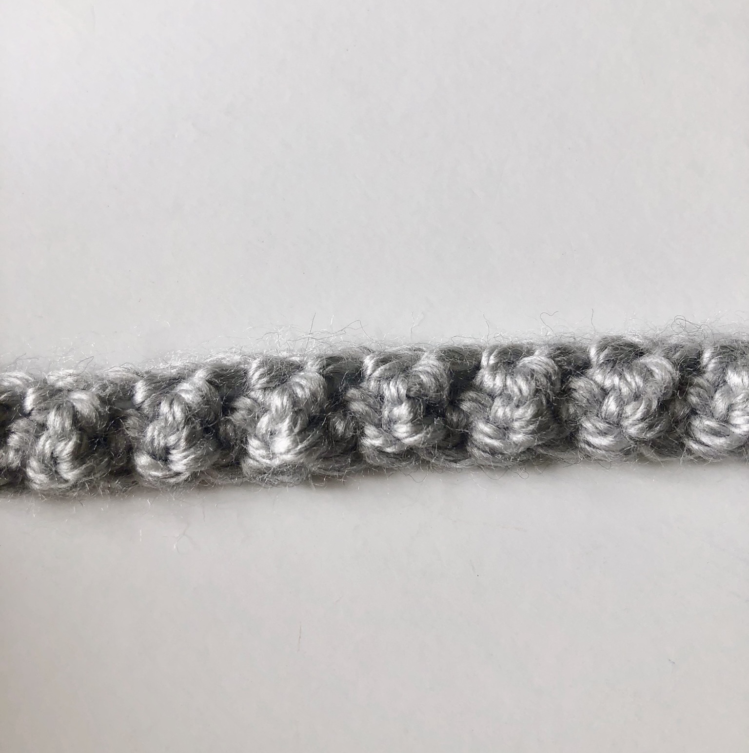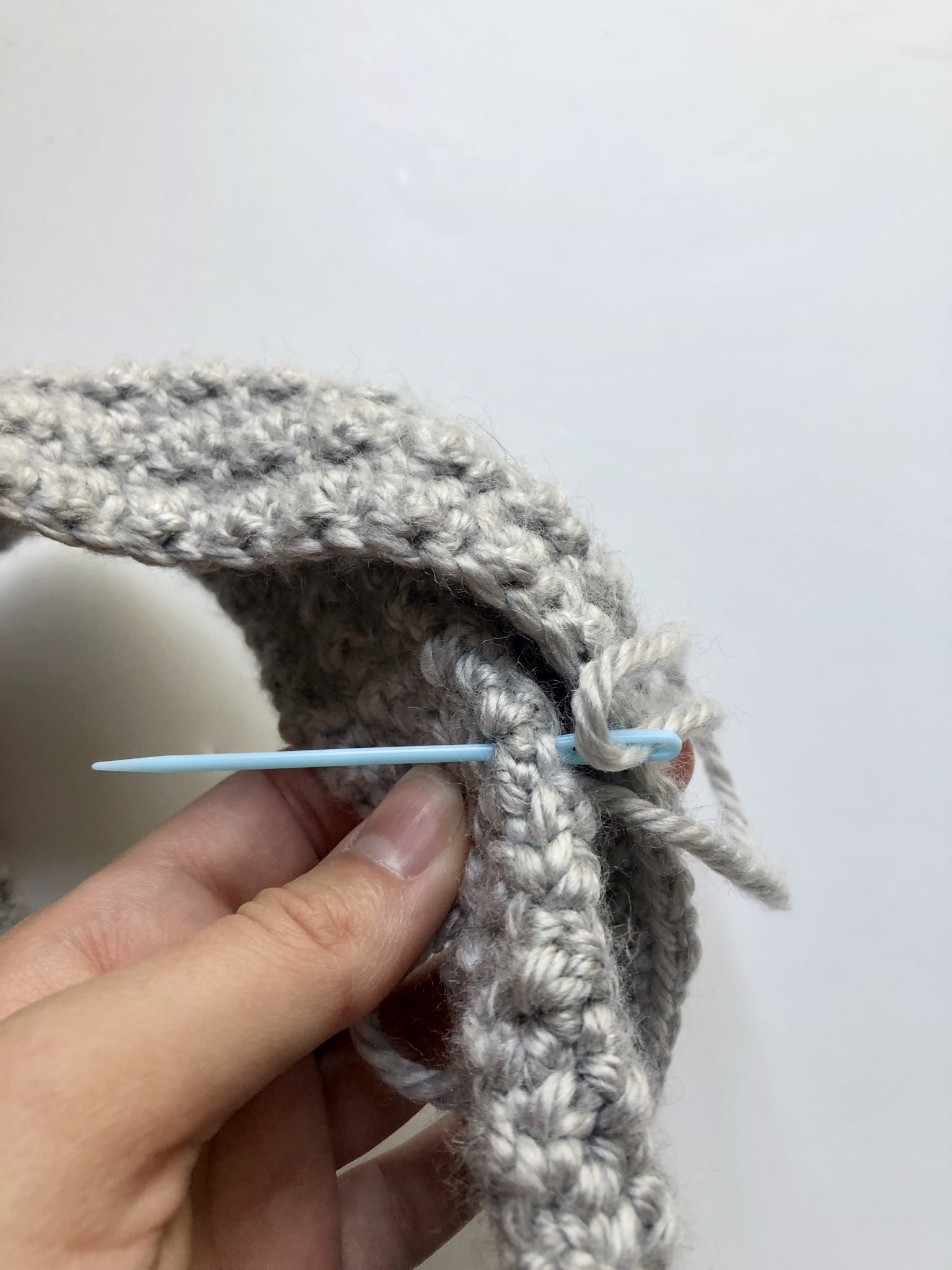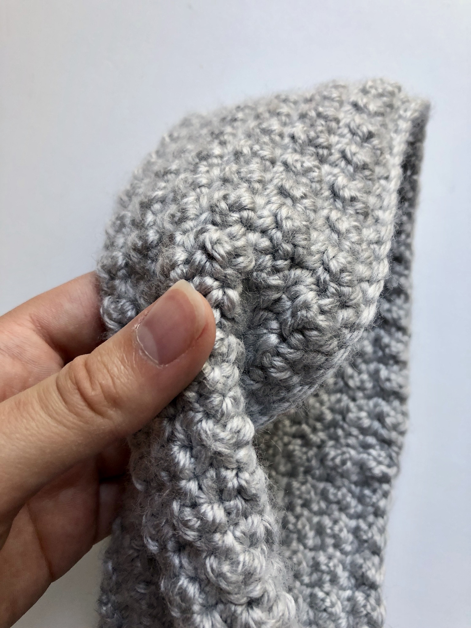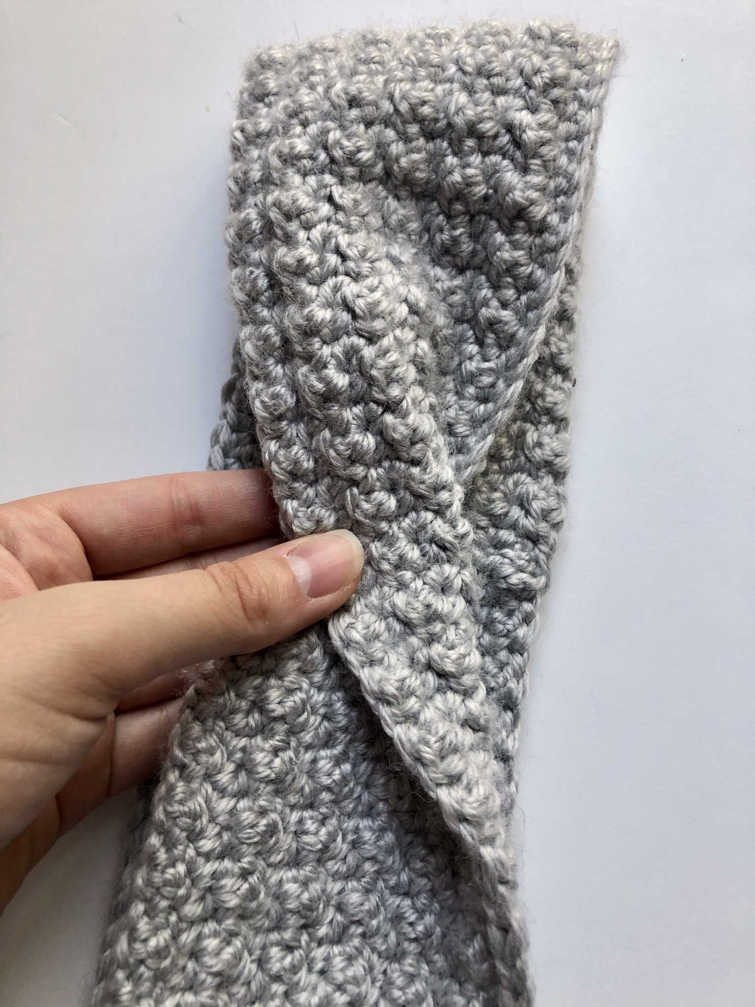 After working the amount of rows needed to achieve the width of your headband, you will fasten off leaving a tail and start assembly.