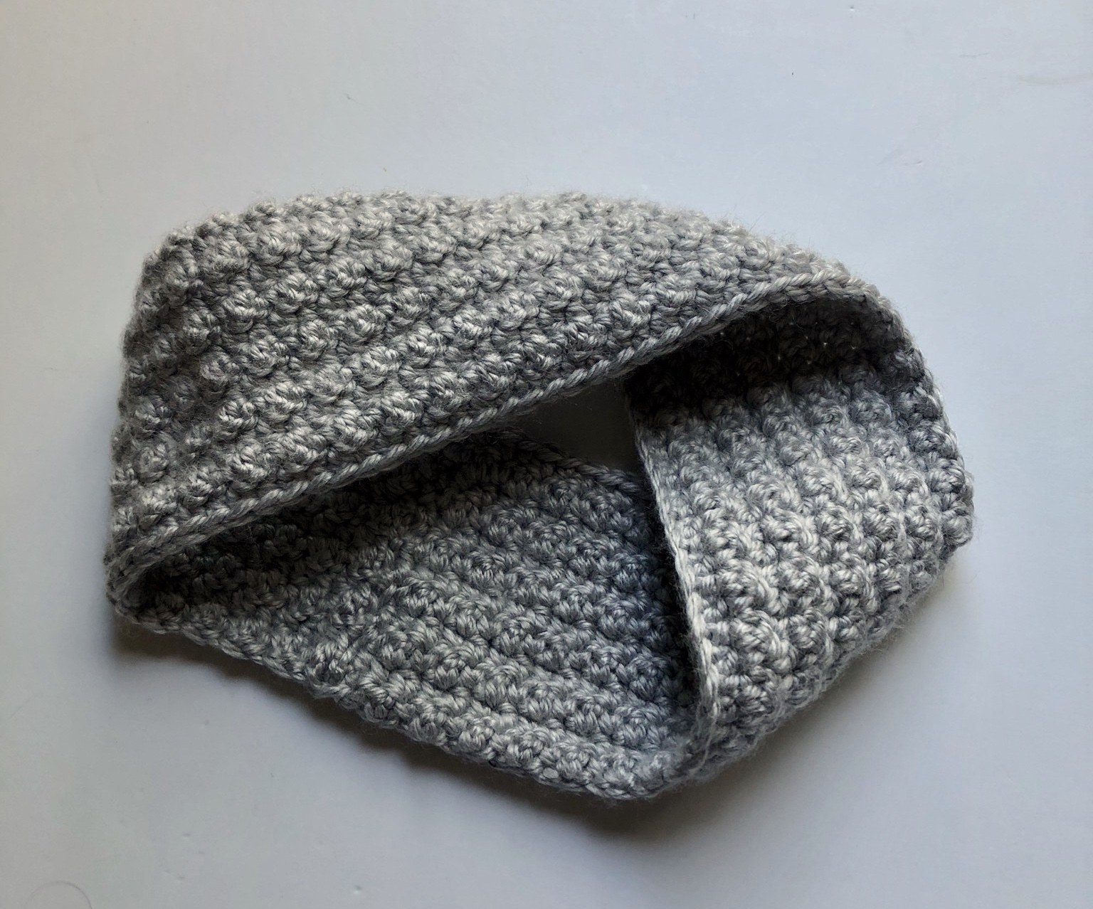 Once you have one continuous circle formed, you will fold down the twisted section. I did this slightly off center across from the seamed end (so that I could wear the twist off to the side of my head) with the seam in back.