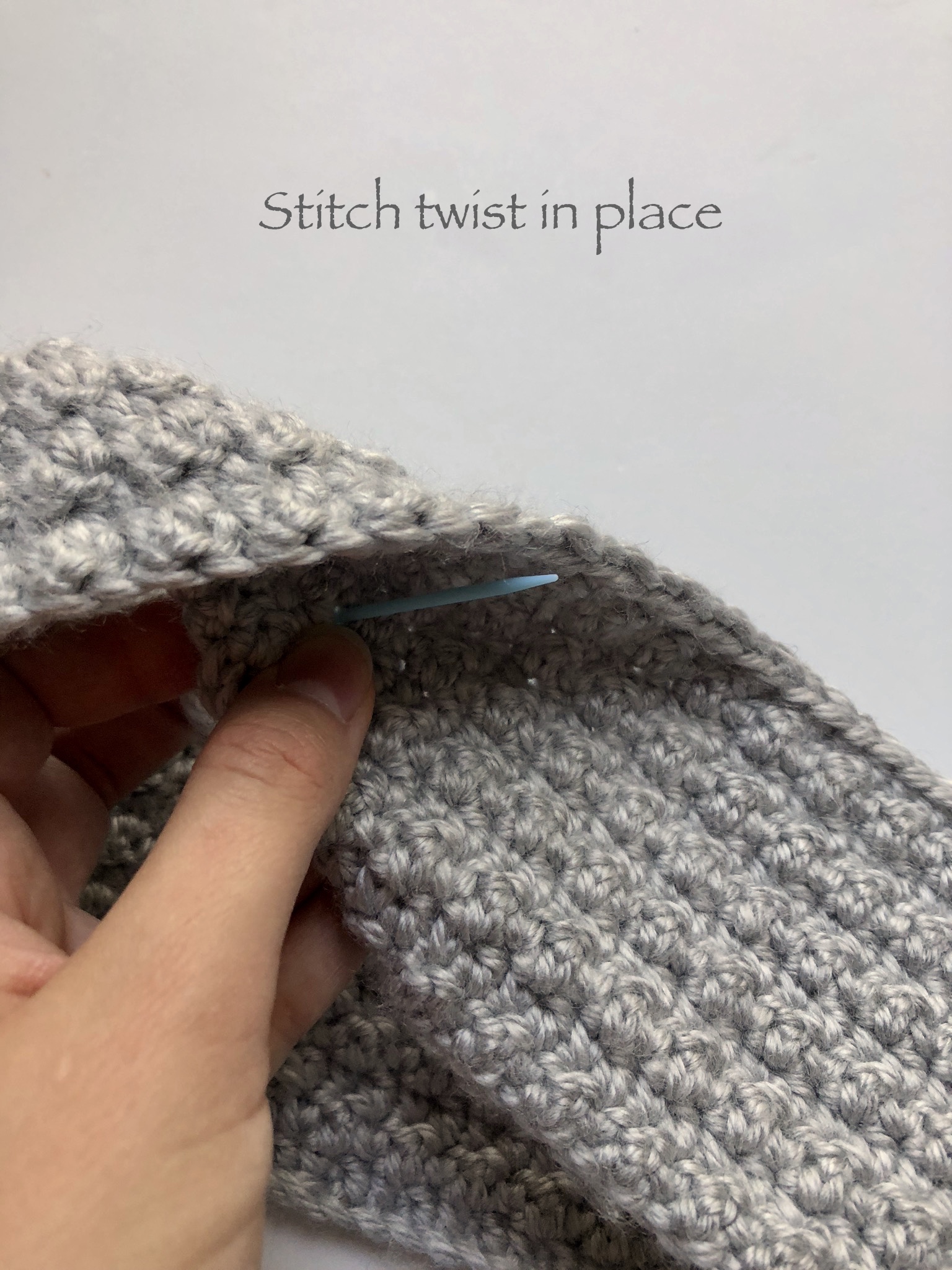 I liked the way the twist looked best when I folded the top portion in half over onto itself. Difficult to explain, but hopefully the pictures help! Once you have a twist look that you’re happy with, stitch it in place using a small strand of yarn and the darning/embroidery needle. I stitched so that the starting and ending strands were on the inside of the twist. This made it so that the tails were easy to weave in and be hidden. Weave in any other strands and thats all there is to it!
