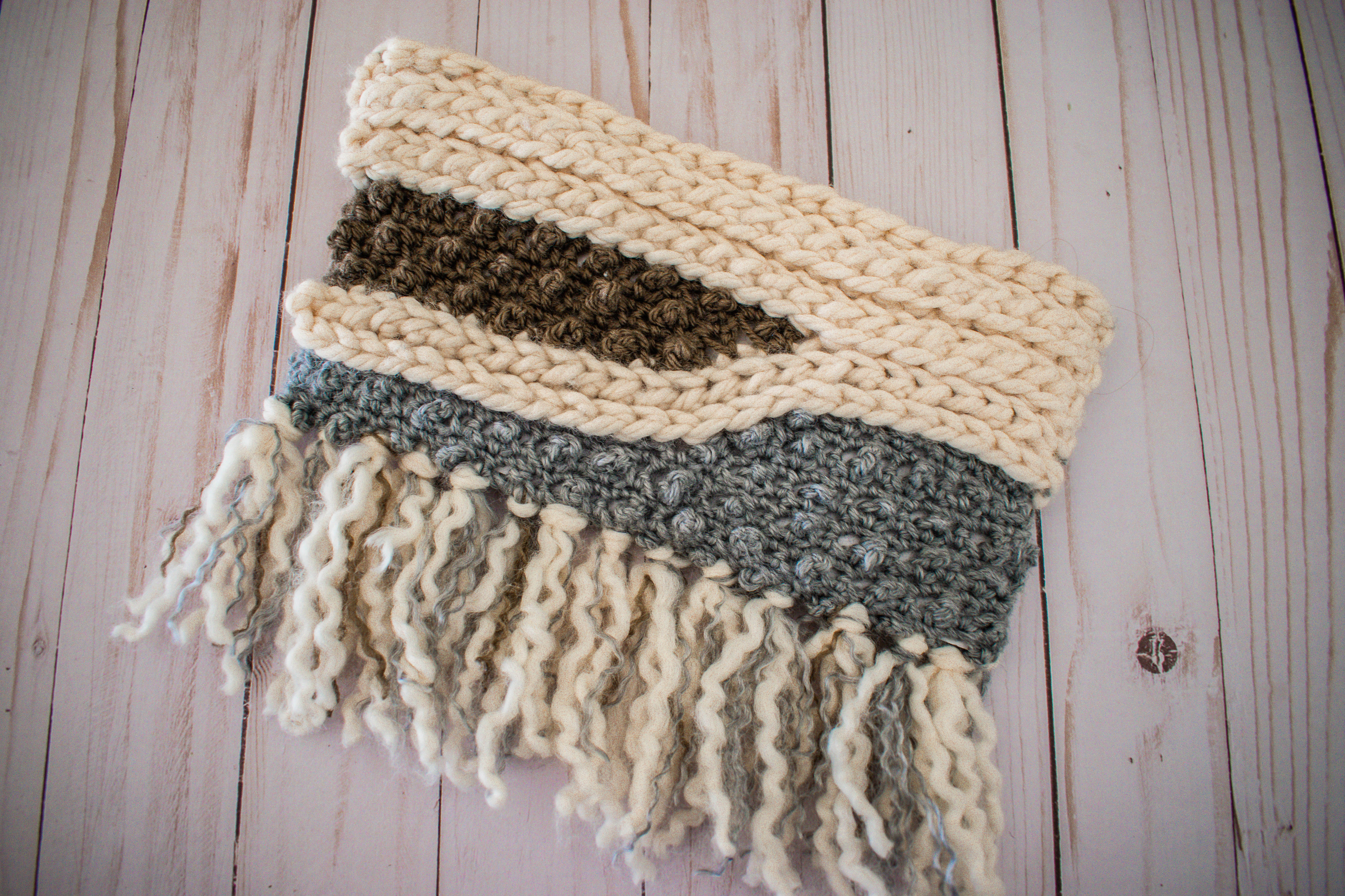 Pick cream colored yarn back up and continue working across the top of the first colored yarn section below